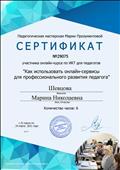 Сертификат участника онлайн-курса по ИКТ для педагогов: "Как использовать онлайн-сервисы для профессионального развития педагога"Педагогическая мастерская Марии Прозументовой 22.03.2021